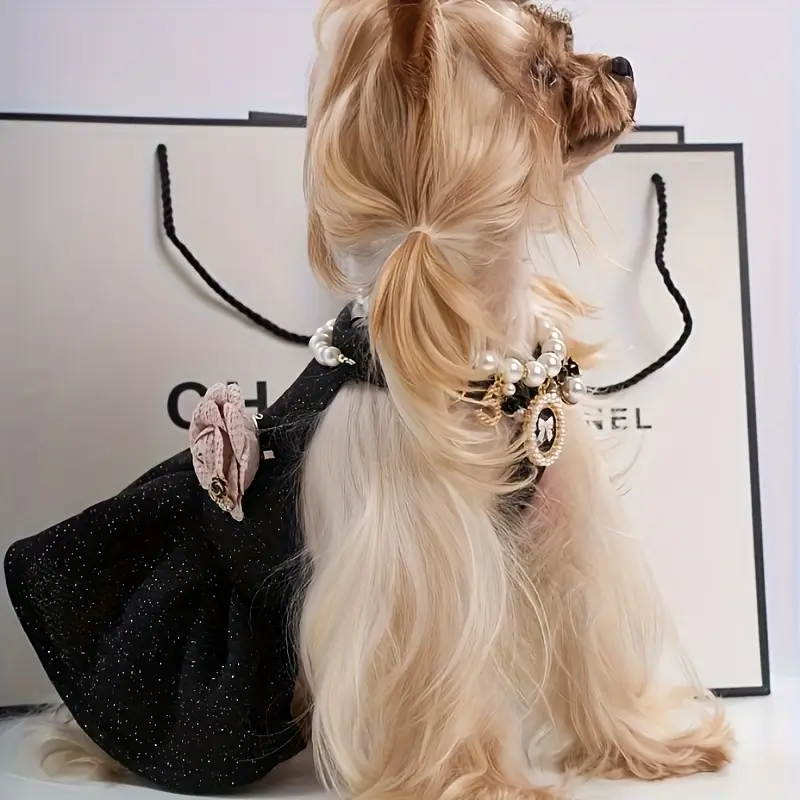 Elevate your B2B pet apparel line with SUN PET‘s sparkling black glitter dog dress. Featuring pearl necklace, purple ruffled skirt & floral bow, perfect for formal events. As a leading factory, we offer wholesale dog dresses and custom dog dresses wholesale with OEM services. Customize sizes, colors, fabrics & designs to match your brand.
