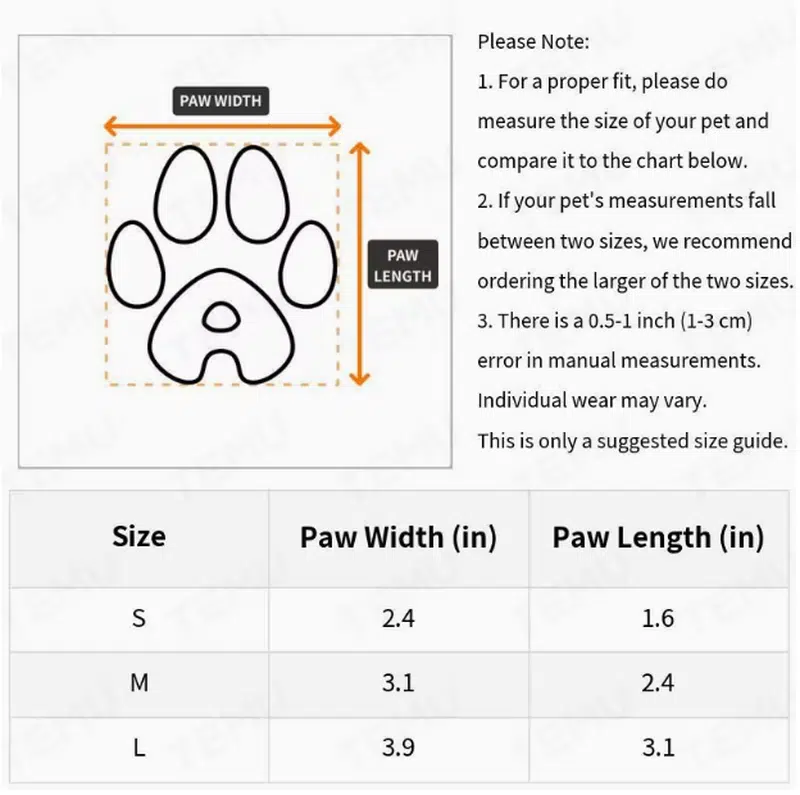| Size | Paw Width (in) | Paw Length (in) |