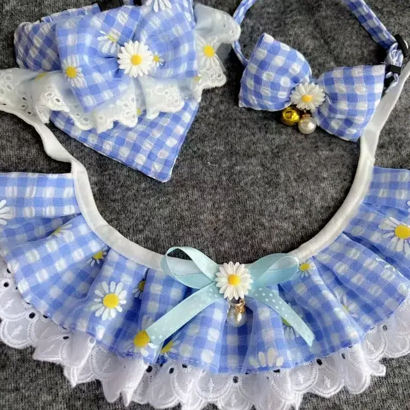 Short Description: Offer wholesale custom pet bandanas in blue gingham daisy print with ruffled lace edges. Ideal for daily wear, Easter photos, or Christmas events. OEM options for B2B partners to tailor sizes XS-XL for cats and dogs. Secure adjustable fit ensures comfort in retail or bulk production.