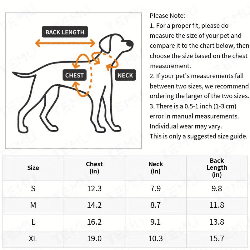 | Size | Chest (in) | Neck (in) | Back Length (in) |