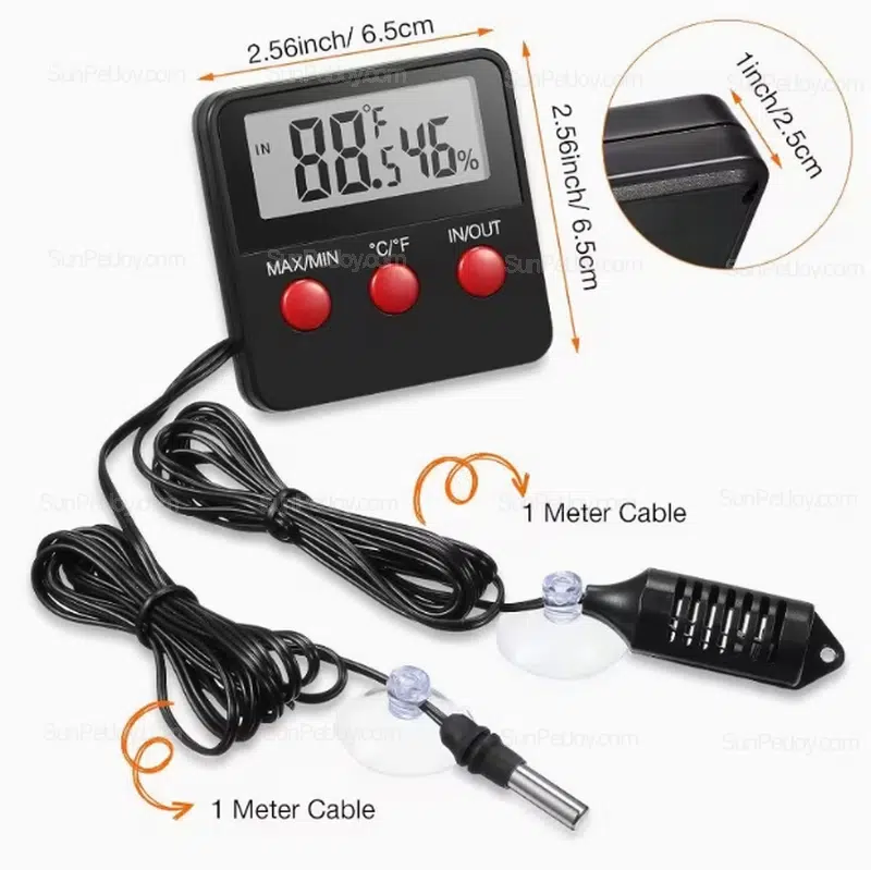 Ensure accurate environmental control in reptile enclosures with this digital thermometer and hygrometer, engineered for reliable dual-sensor monitoring. One probe measures temperature precisely at basking or warm zones, while the integrated humidity sensor tracks conditions in cooler, shaded areas—delivering the gradient data essential for reptile health and comfort.