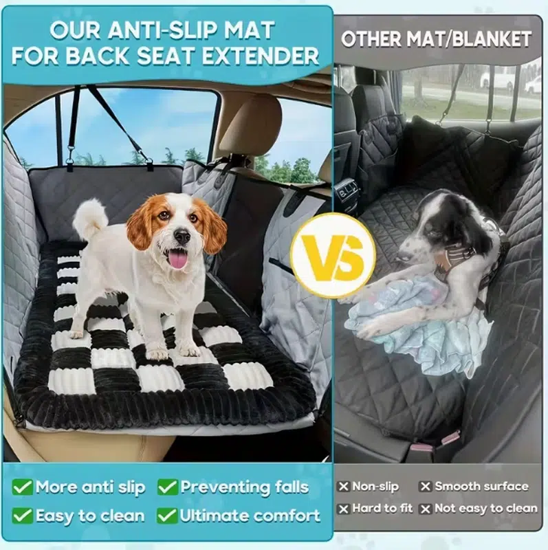 The mat features a textured anti-slip bottom that grips the car hammock or backseat extender,