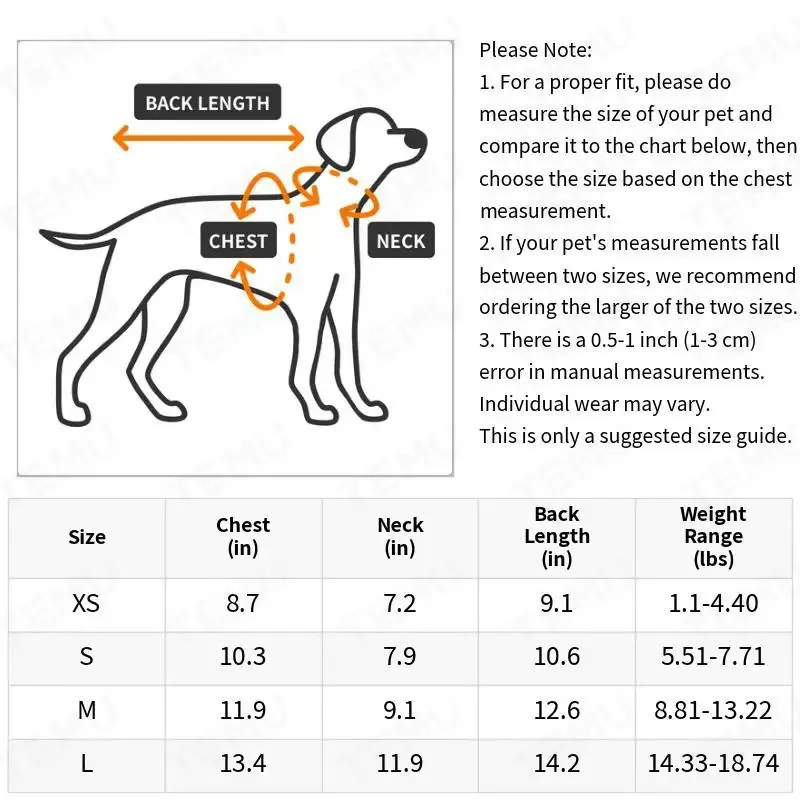 | Size | Chest in | Neck in | Back Length in | Recommended Weight lbs |