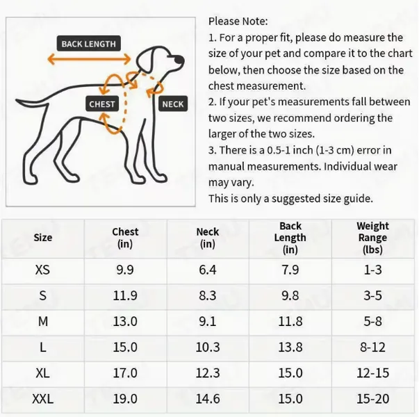 | Size | Chest (in) | Neck (in) | Back Length (in) | Weight Range (lbs) |