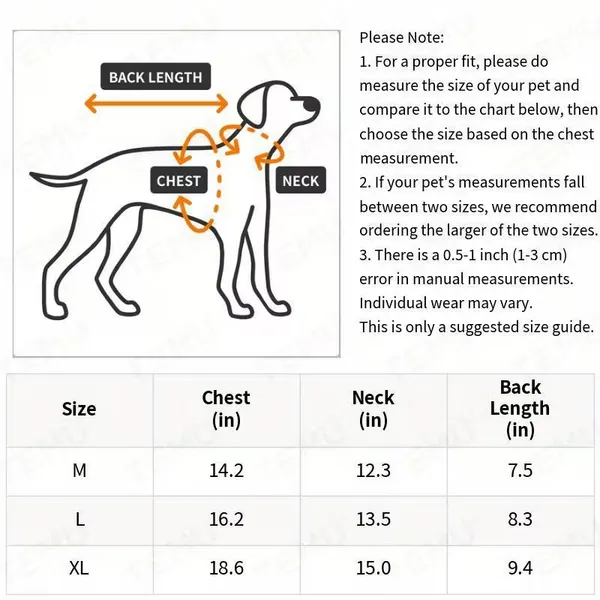 | Size | Chest (in) | Neck (in) | Back Length (in) |