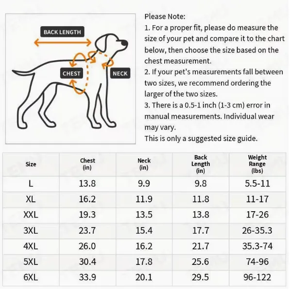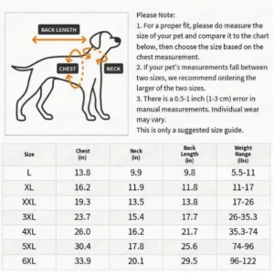 | Size | Chest (in) | Neck (in) | Back Length (in) | Weight Range (lbs) |