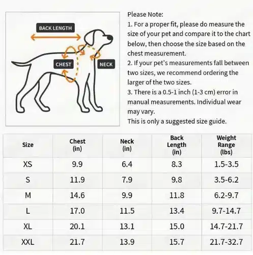 | Size | Chest (in) | Neck (in) | Back Length (in) | Weight (lbs) |