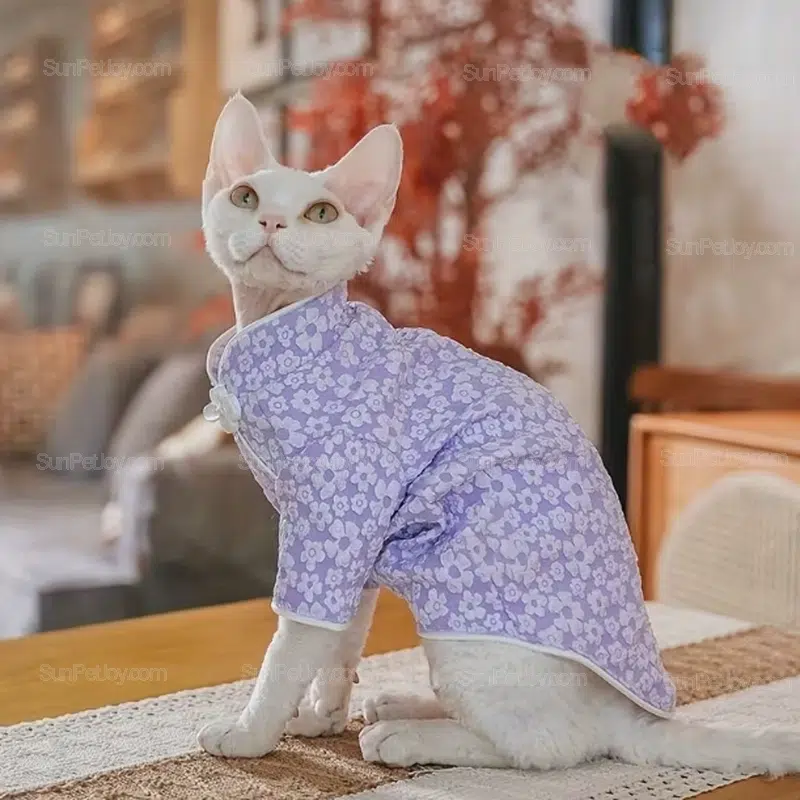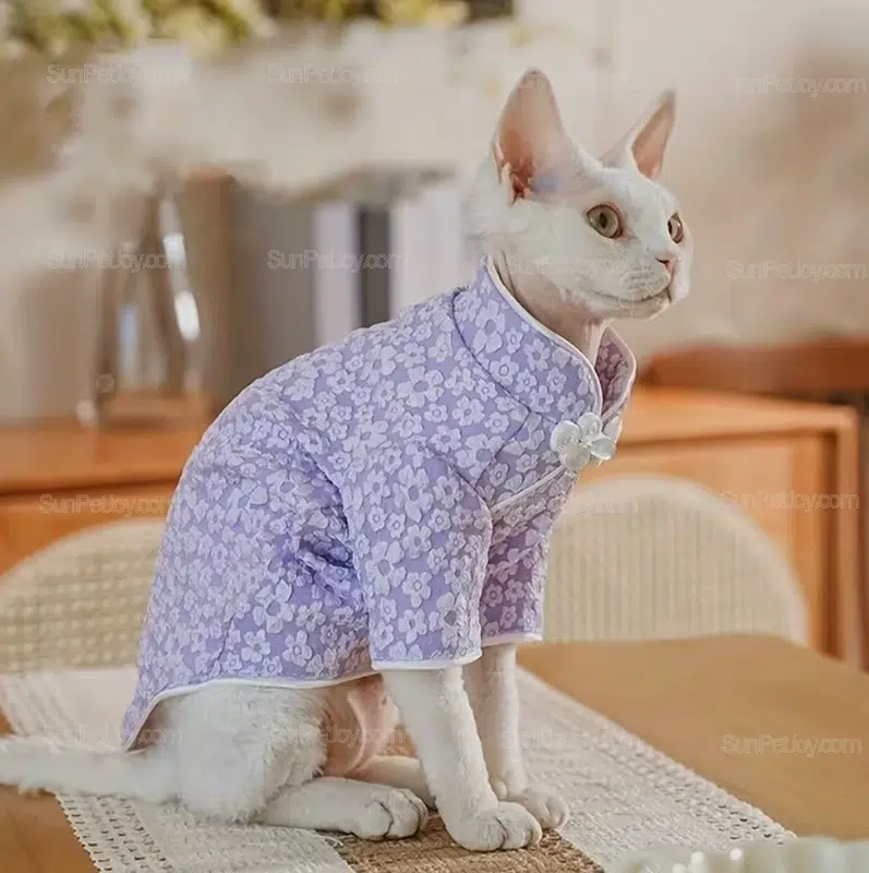 Elevate your pet boutique offerings with our embroidered floral cat dress, crafted from 100% polyester for all-season comfort. This elegant piece suits Sphynx and other hairless breeds, blending style with functionality for winter warmth or spring photoshoots.