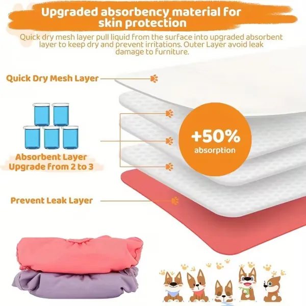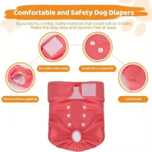 Premium washable dog diapers for female dogs in heat, incontinence or training. 3-layer super absorbent system (+50% absorption), quick-dry mesh, leak-proof barrier. Includes adjustable Y-style suspender with strong metal clips – secure fit, no slipping, no neck risk.