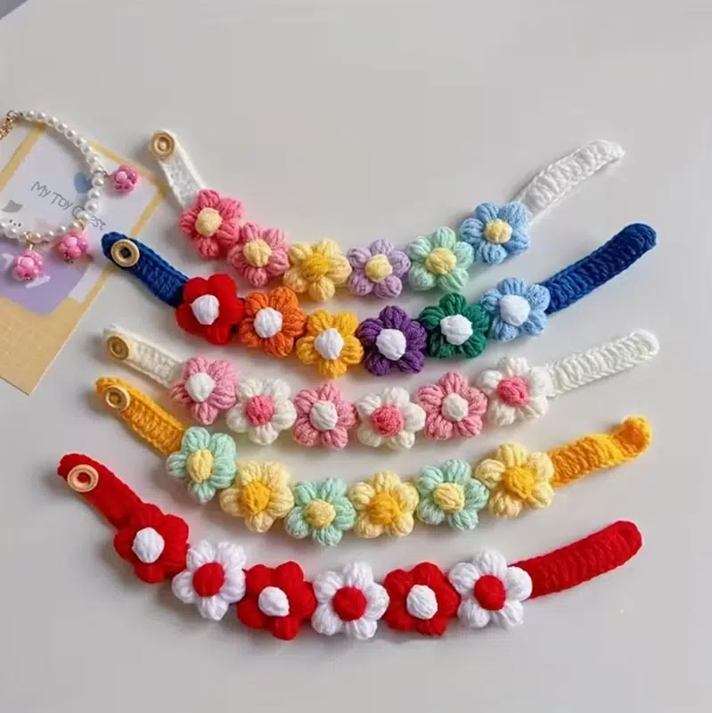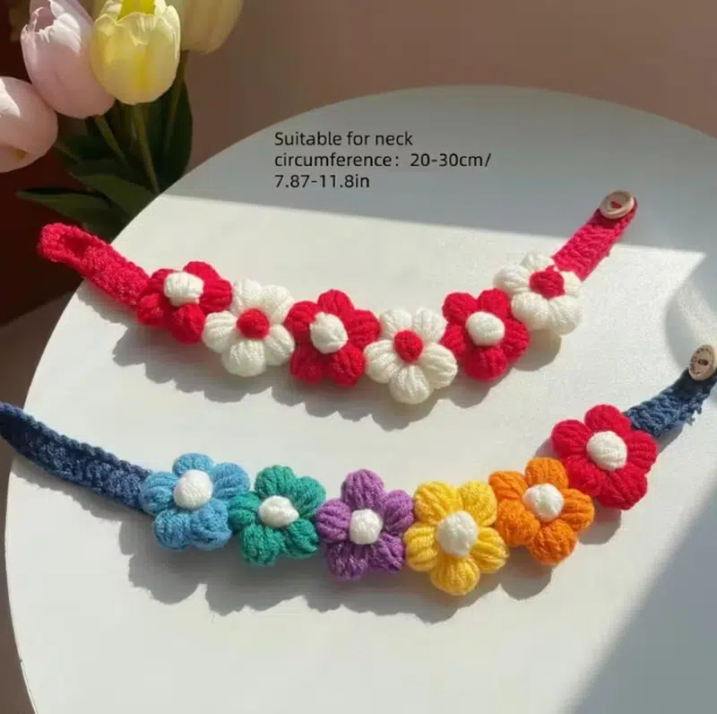 Wholesale crochet floral pet collars with secure button closure. Soft knit, vibrant colors, fits 8-12″ necks. Perfect for OEM/private label brands and bulk pet accessory suppliers.