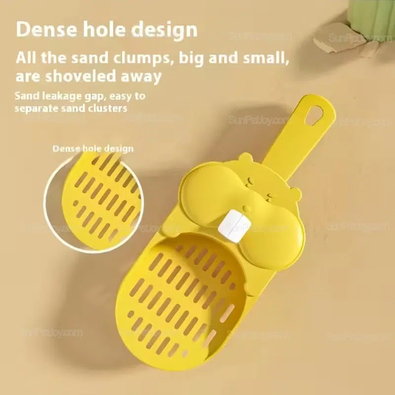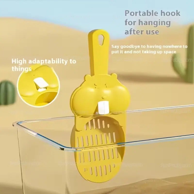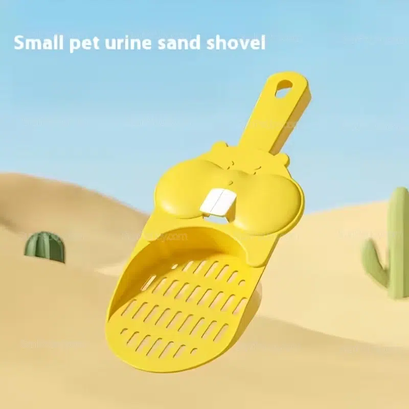 Cute plastic cat litter scoop, specially designed for small animals such as hamsters. Quickly sifts out urine clumps without wasting litter, and features a convenient hanging hook for storage. Suitable for daily cleaning in pet shops and breeding farms. B2B wholesale and factory OEM customization are available.