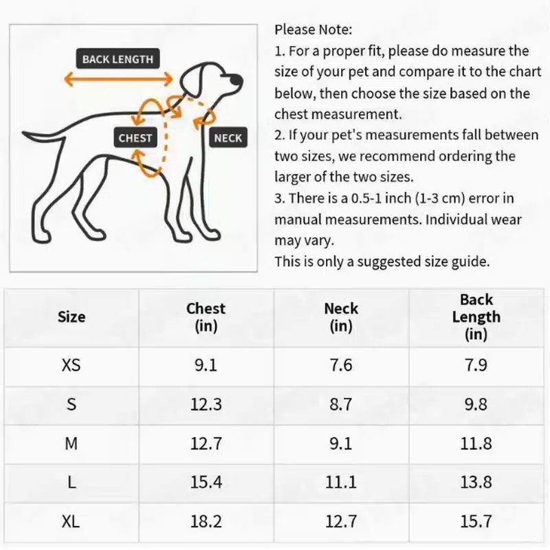 | Size | Chest (in) | Neck (in) | Back Length (in) |