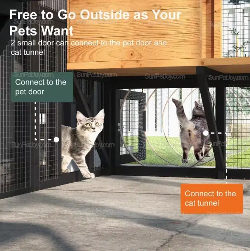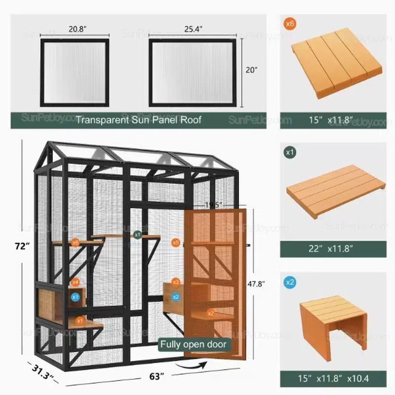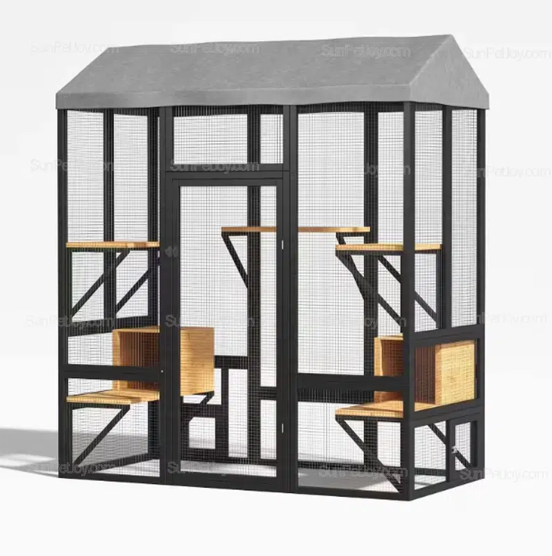 The structure combines a reinforced wood frame with durable metal wire enclosure panels. Surface finishes are selected for outdoor stability, while platform spacing is optimized for adult cats and shared use. SUNPETJOY applies controlled manufacturing standards to ensure consistency for wholesale and OEM orders.