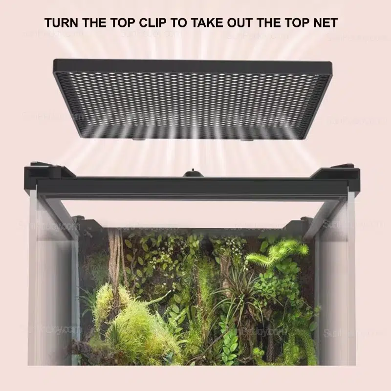 - Removable screen top supports airflow and overhead heating or UVB fixtures