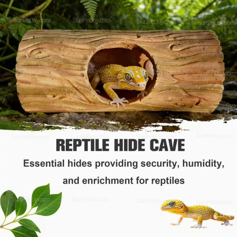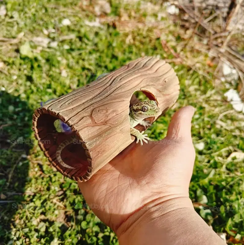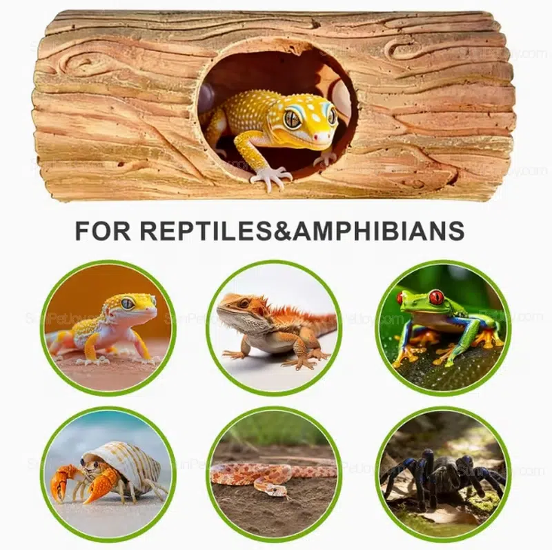 The enclosed log structure helps reduce stress by offering a shaded retreat, making it suitable for breeding setups, retail displays, and custom terrarium projects.