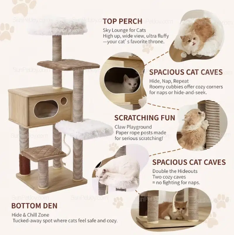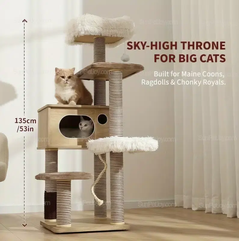 Elevate your pet retail offerings with the SUNPETJOY Sky-High Throne, a premium multi-level cat tree tower designed for large breeds like Maine Coons and Ragdolls. This sturdy cat furniture combines scratching posts, cozy cat condos, and luxurious perches for ultimate feline comfort.