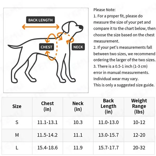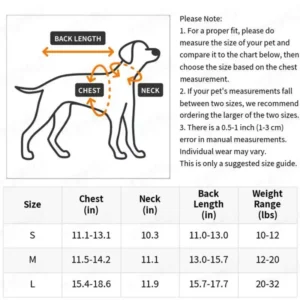 | Size | Chest Girth (in) | Neck Girth (in) | Back Length (in) | Weight Range (lbs) |