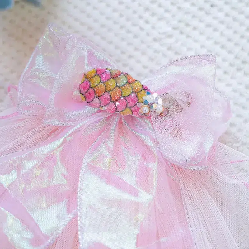 B2B exclusive: Factory-direct pastel pink iridescent mermaid bow veil dress for small dogs & cats (Pomeranian, Chihuahua, Shih Tzu, Yorkshire, etc.). Premium multi-layer holographic tulle with sequin mermaid-scale bow center, ruffled edges, Velcro closure. High-margin style for pet apparel wholesalers and brands.