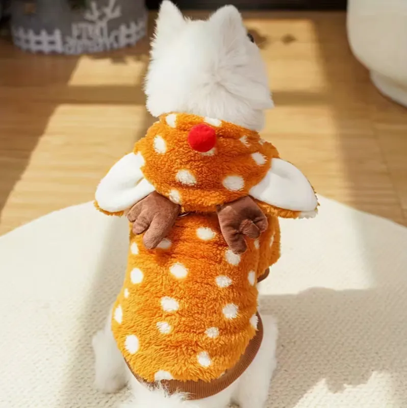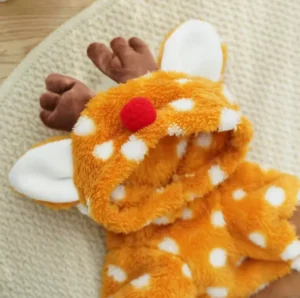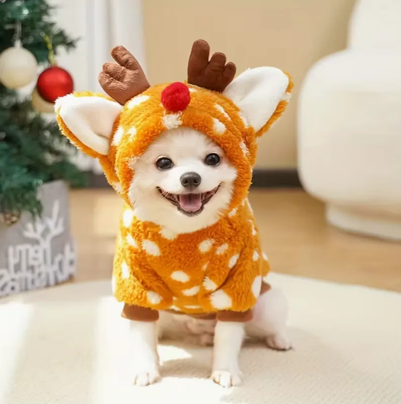 Elevate your B2B pet apparel lineup with SUN PET‘s premium orange fleece reindeer jumpsuit. Crafted in our Guangdong factory, this cozy 100% polyester outfit features antler hood, red nose, and spotted design—perfect for holiday wholesale. Attract retailers with high-margin, festive small/medium dog & cat clothes.