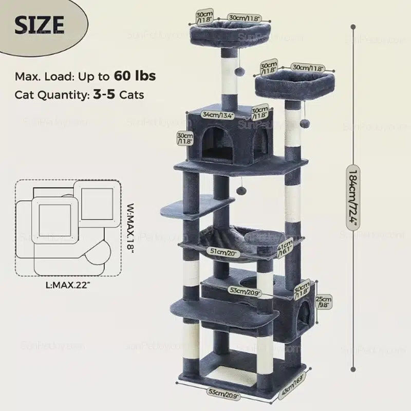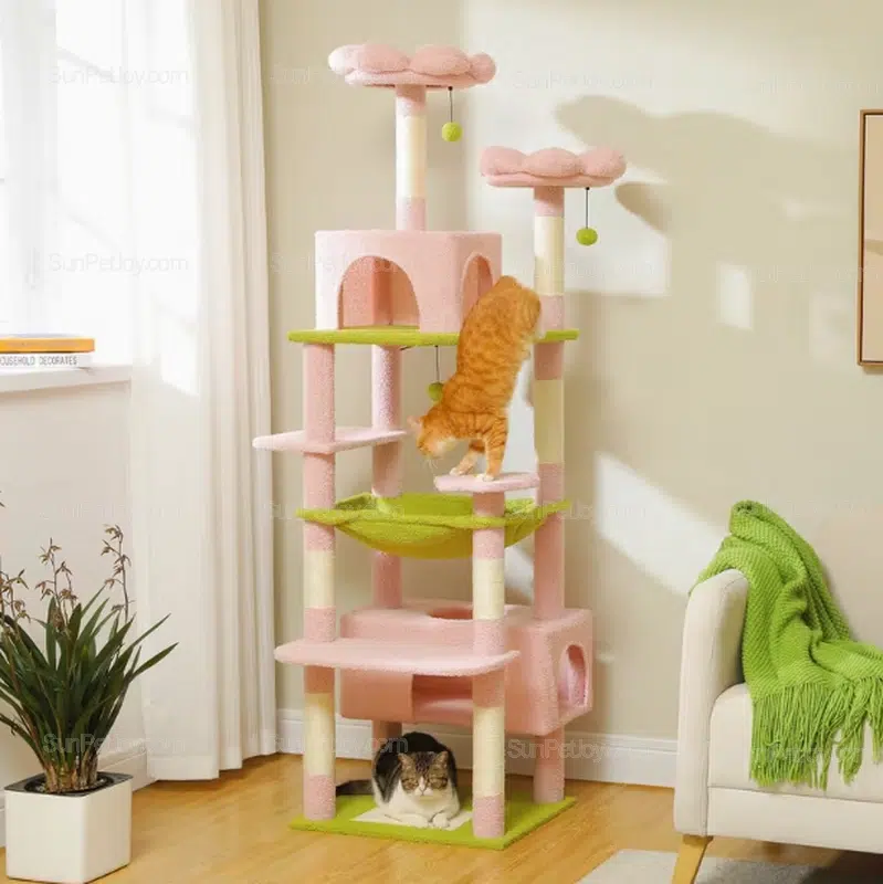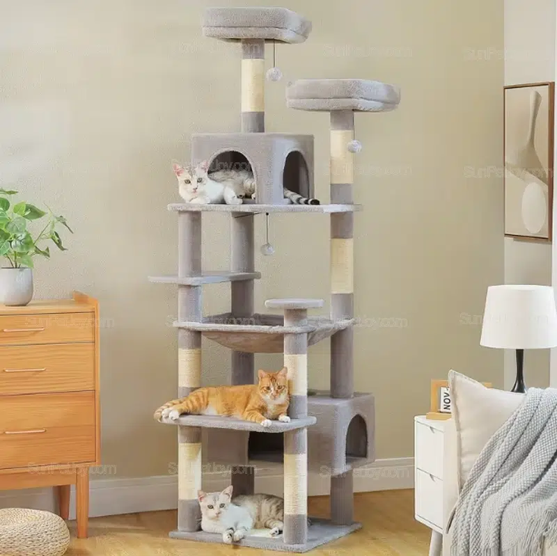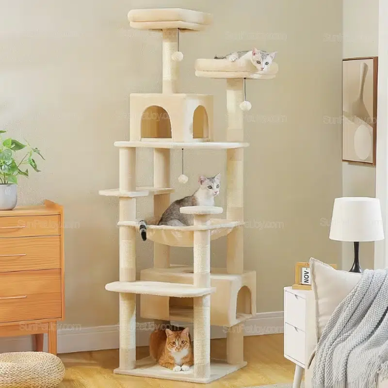 Discover the SUNPETJOY 72-inch multi-level cat tree tower, a heavy-duty cat furniture solution designed for wholesalers seeking reliable, customizable pet products. Crafted with premium sisal scratching posts for claw maintenance, padded perches for cozy lounging, a spacious condo for hiding, and a hammock basket for play, this tower supports up to 60 lbs and accommodates 3-5 cats. Ideal for large cats and kittens, it features a sturdy base to prevent tipping, ensuring safety in busy pet environments like retail stores or breeding facilities.