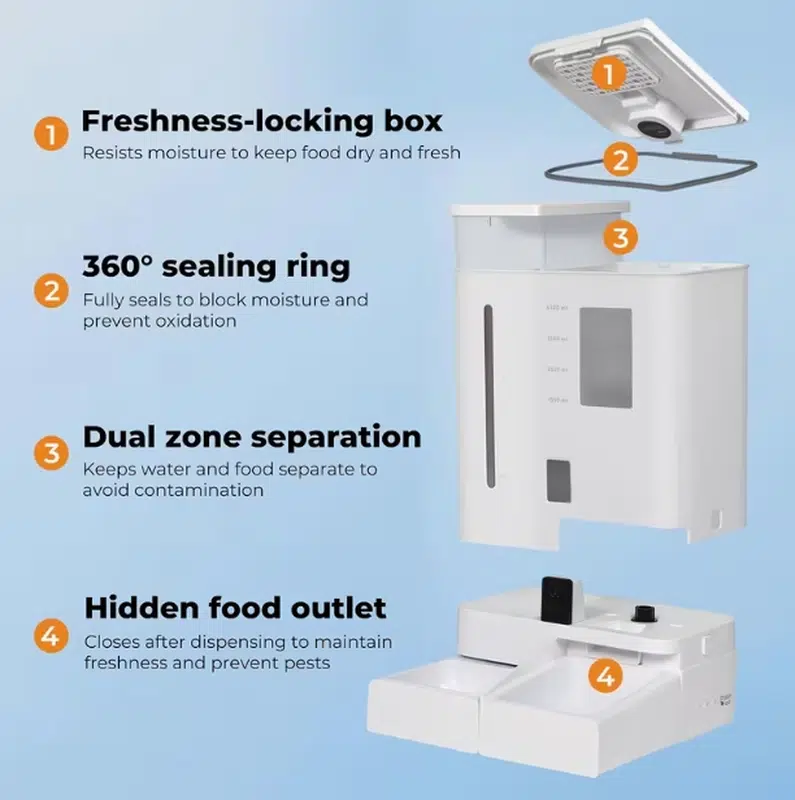 With separate food and water storage, dual-band WiFi connectivity, and integrated camera support,