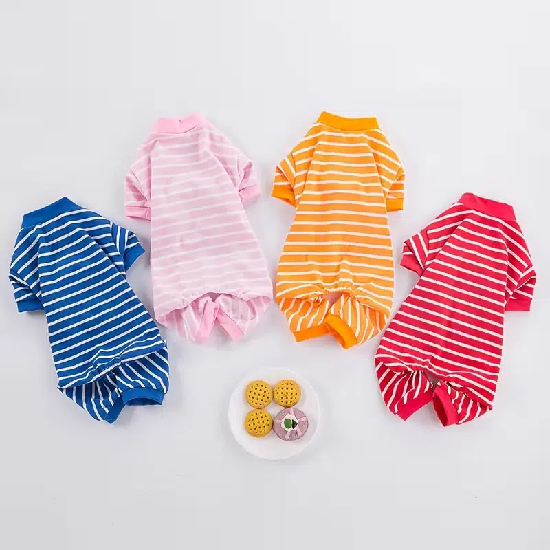 Soft breathable 95% cotton striped dog pajamas, perfect for small to medium breeds. Year-round comfort, easy pull-over style. MOQ 50pcs with private label & custom colors available. Ideal for wholesalers and OEM brands.