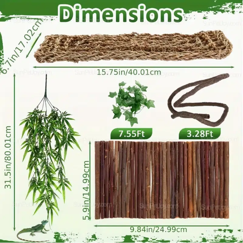 - Includes hammock, bridge, hideout, vines and decor elements