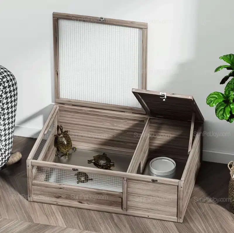 Designed for breeders and distributors, this wooden tortoise enclosure features dual access lids and a mesh top, supporting bulk supply and size customization.