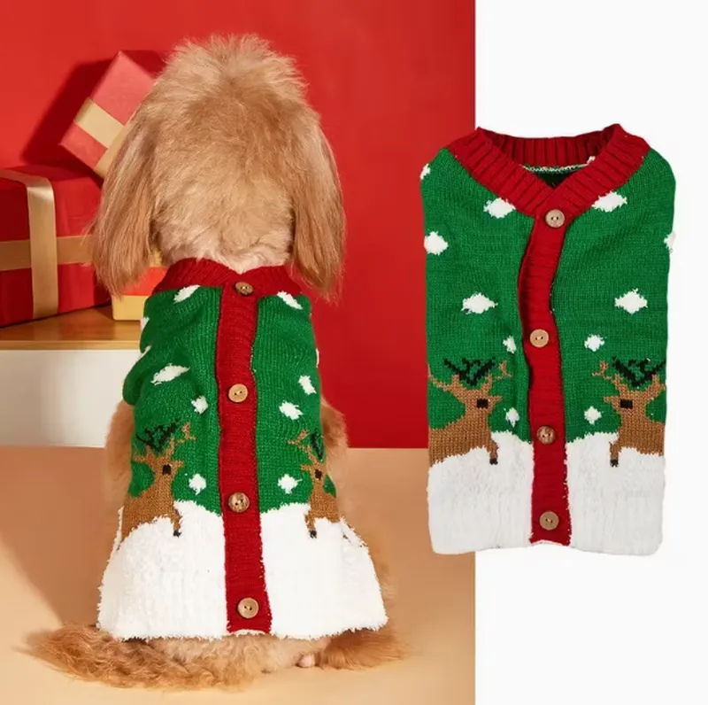 Cozy wholesale dog Christmas sweaters for B2B factories. OEM custom designs with elk, tree, snowflake. Ideal for holiday pet outfits in autumn/winter.