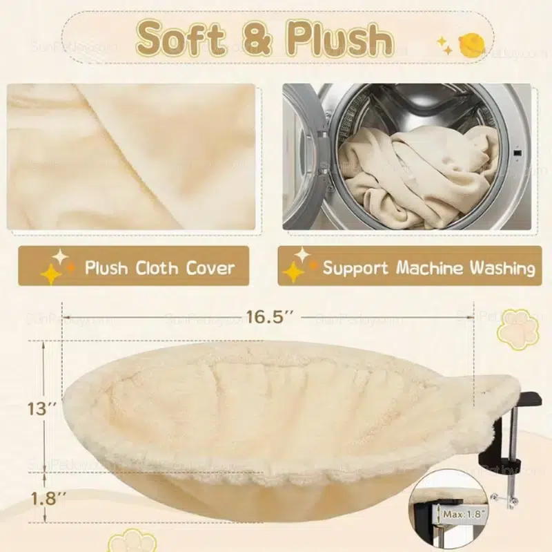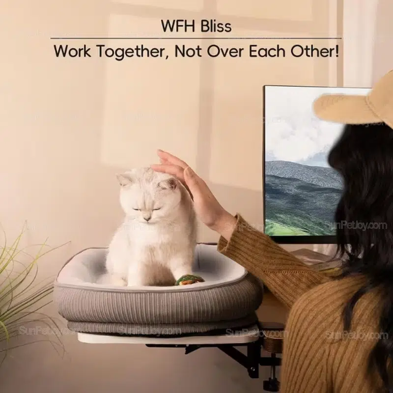 Designed for modern workspaces, this clamp-on desk cat bed creates a dedicated resting area without occupying desktop space. The foldable structure supports up to 50 lbs and installs in seconds, making it suitable for shared workstations, home offices, and private-label pet furniture programs.