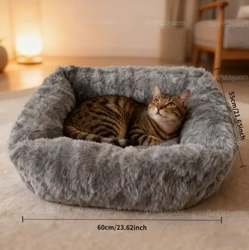 Designed for bulk supply, this winter plush cat bed features a stable non-slip base and supports custom sizing, fabrics, and private label production for pet brands.