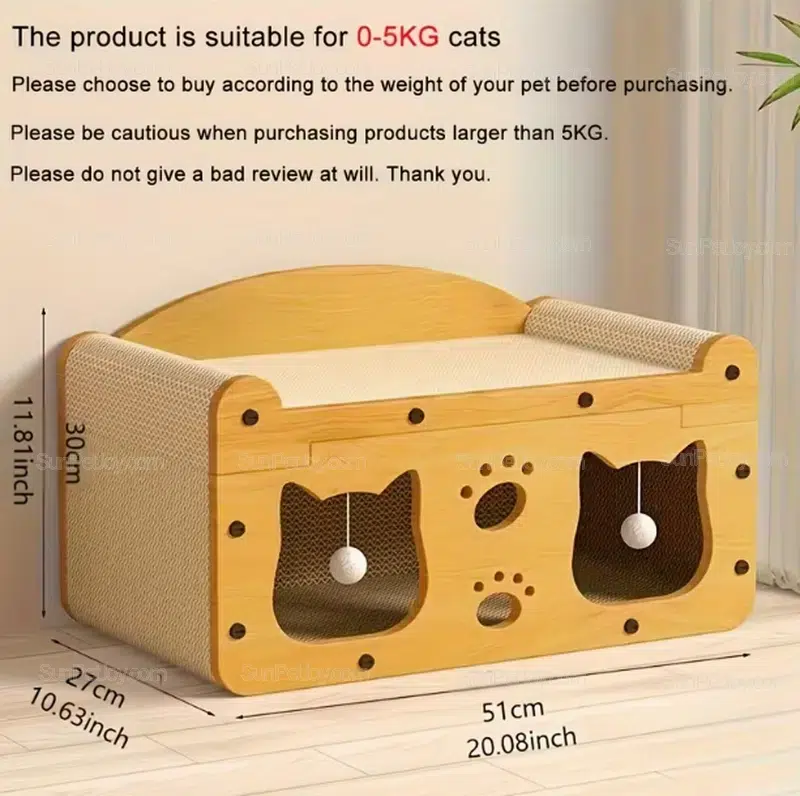 Wholesale cardboard cat scratching house designed for indoor use, combining scratch surface and resting bed. Factory direct supply with custom size, logo, and packaging options.