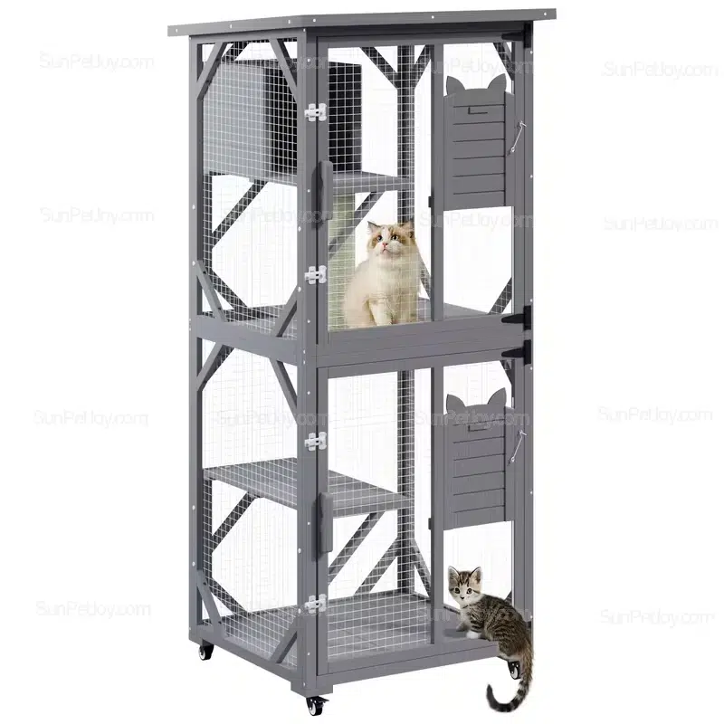 Wholesale movable wooden cat enclosure with wheels: Ideal for OEM/ODM factories. Customizable, durable fir wood frame, weatherproof roof, easy indoor-outdoor mobility for 2-4 cats.