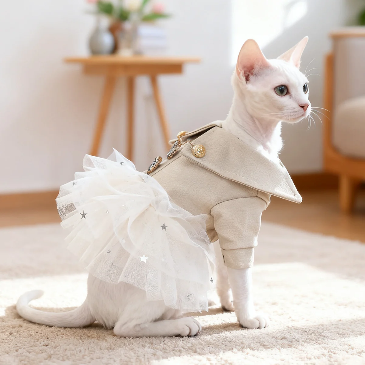 Our collection features stylish and functional designs including cozy hooded sweatshirts, elegant knitted dresses, playful holiday costumes (Halloween, Christmas, Chinese New Year), warm winter jackets, and practical recovery suits. Every piece uses premium materials such as soft polyester, fleece linings, delicate lace, and shimmering sequins. Available in sizes XS to 2XL, our cat apparel fits kittens, adult cats, and even hairless breeds like Sphynx, with thoughtful details like adjustable straps and metal D-rings for safety and comfort.
