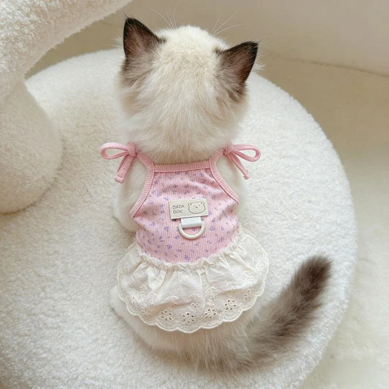 The kitten dress is a lavender ribbed cat harness with delicate all-over pattern, detachable white lace ruffled skirt, integrated metal D-ring and adjustable bow ties for functional pet apparel available in S to XXL sizes.