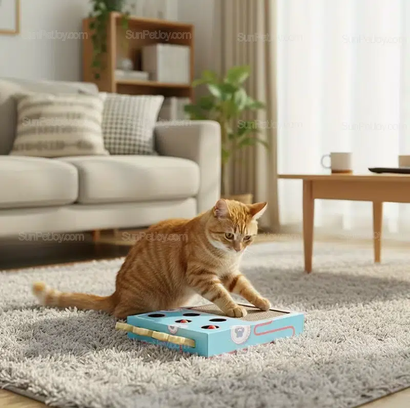 OEM cat 3-in-1 scratching board for indoor enrichment, combining scratch pad and interactive mice play. Custom colors, structure, and packaging supported.