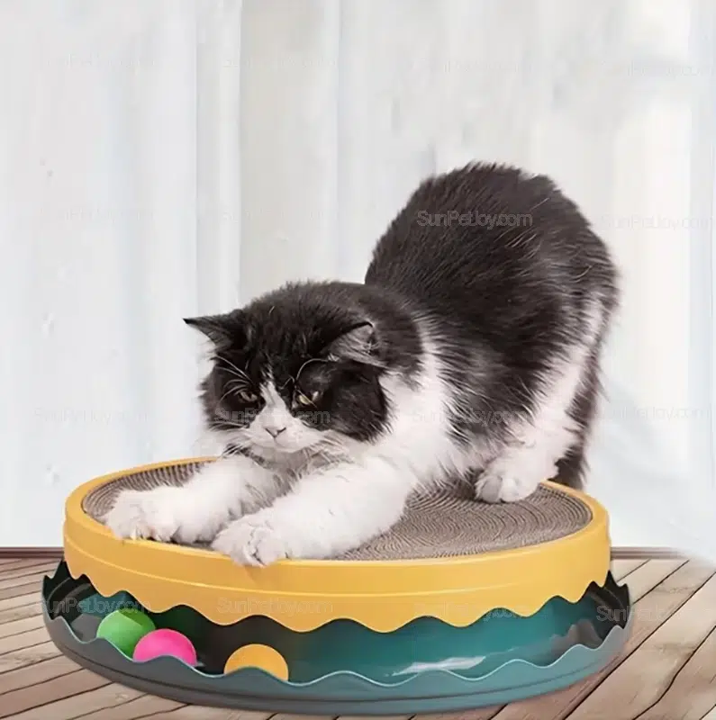 Durable circular cat scratcher with reinforced cardboard core and ball track base. Designed for wholesale and OEM buyers seeking customizable, long-lasting cat scratching solutions.