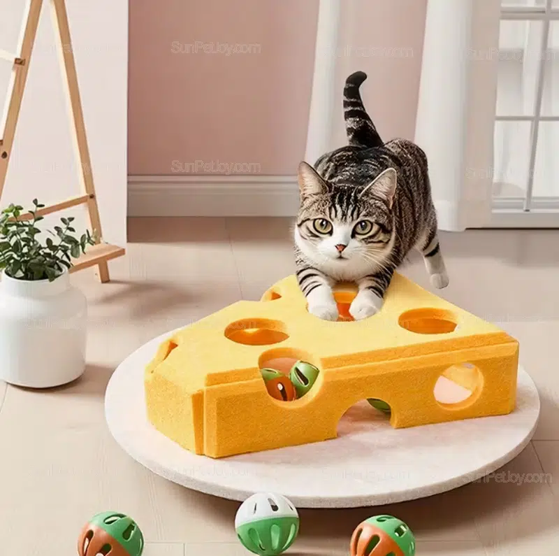 Structured cat puzzle board featuring a felt cheese-style maze with enclosed ball channels, designed for OEM customization and scalable wholesale supply.