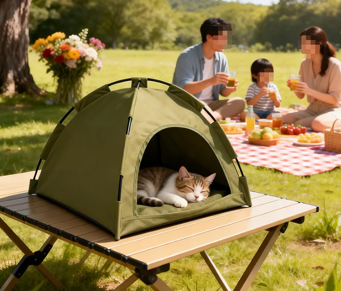 The waterproof outdoor cat tent is a portable folding pet shelter constructed from durable green 600D Oxford cloth with ventilation mesh and a quick-setup metal frame, available in M and L sizes for small pets such as cats and dogs, suitable for outdoor camping and indoor use.