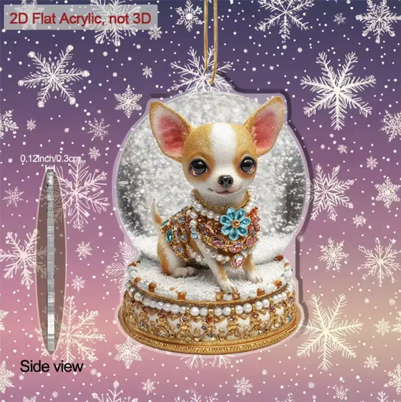 Wholesale flat acrylic snow globe dog ornaments ready for your custom branding or OEM production. Perfect for Christmas trees, keychains, rear-view mirrors, or pet store holiday displays. Durable, vibrant print, gem collar detail.