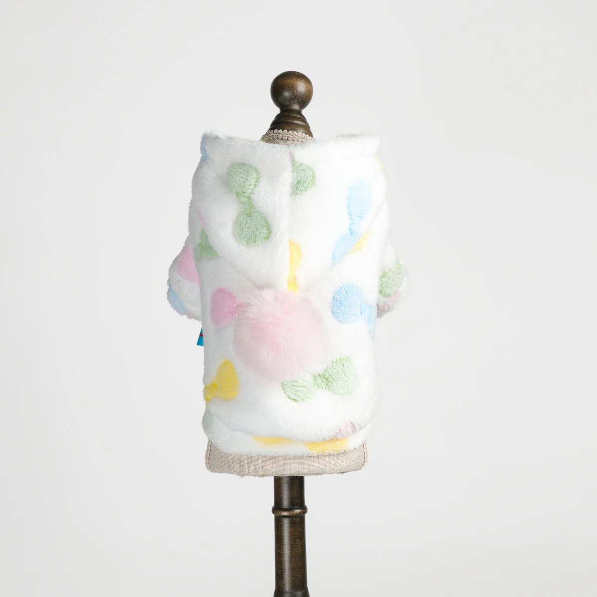 A white plush hooded pet jacket made of polyester with colorful bow patterns and pink pom-pom accents available in XS to XL sizes for small pets.