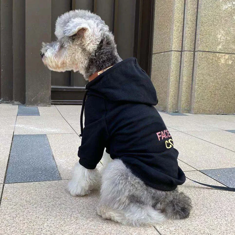 The dog jacket with hood is a black cotton garment with hood design, letter pattern printed on the back and metal traction ring, produced in sizes XS to 3XL according to the measurements of bust back length and neck circumference with 2-3cm manual measurement tolerance for wholesale by pet clothing suppliers.