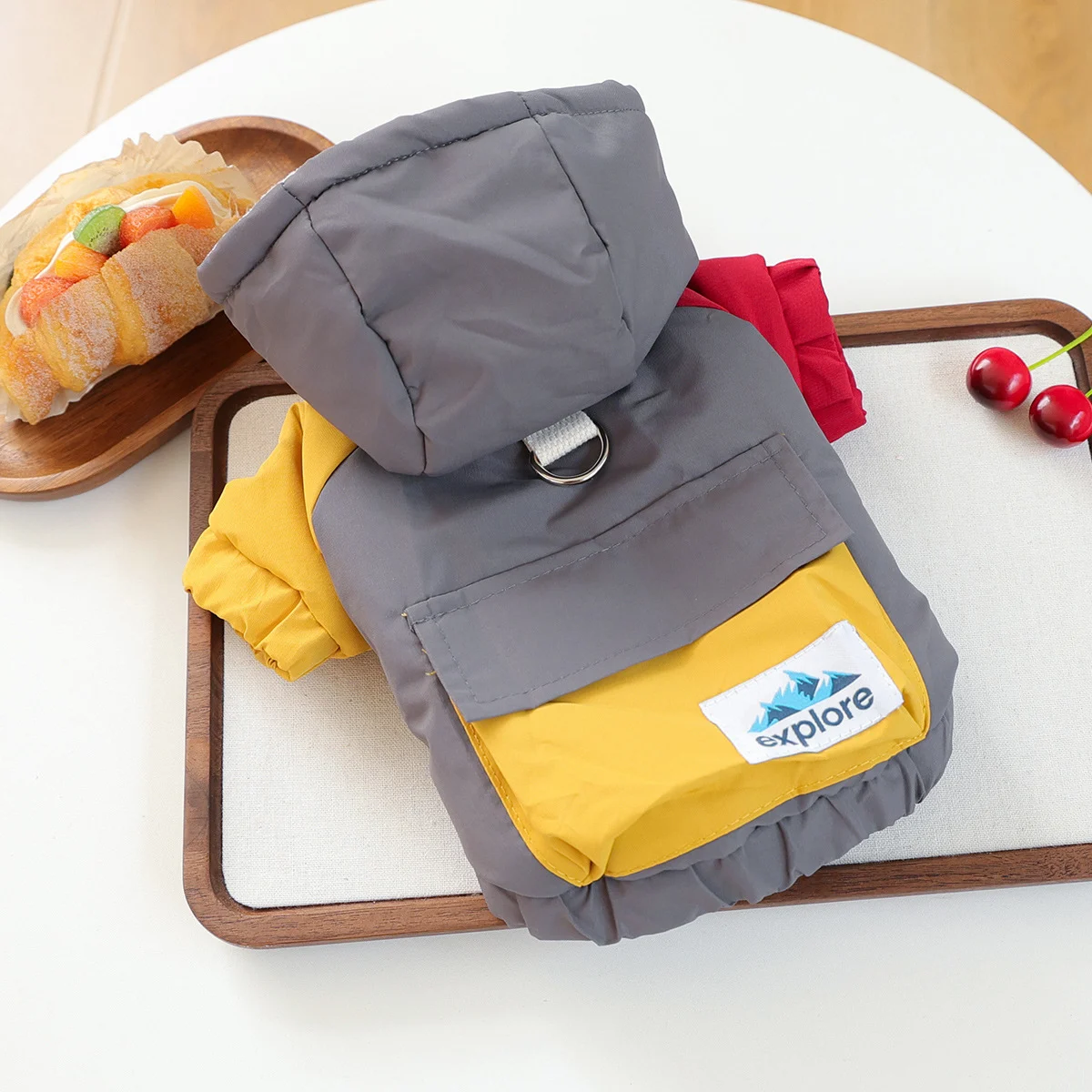 This lightweight dog coats is a waterproof pet raincoat constructed with acrylic material in colorful splicing design, featuring a hood with adjustable drawstring, back D-type traction ring and functional pocket, developed for cats and available in sizes XS to 2XL.