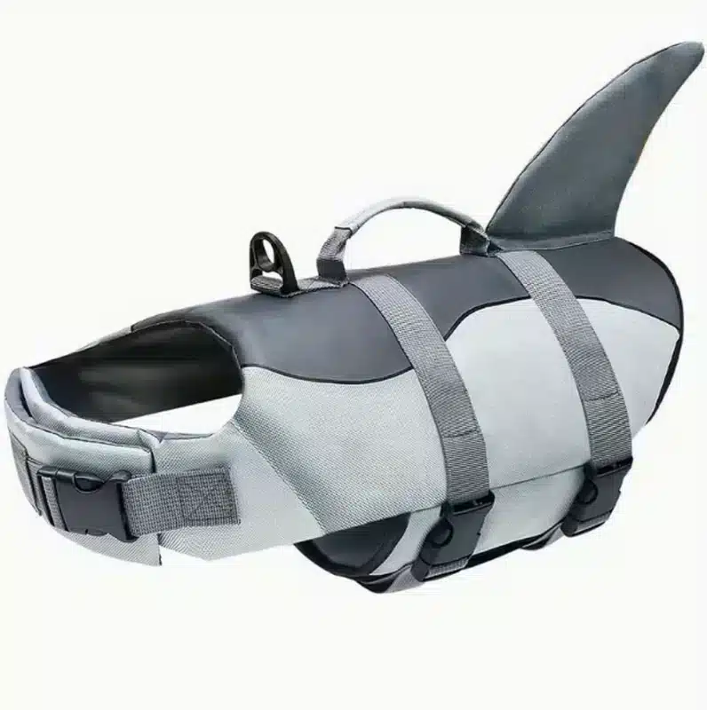 SUN PET shark fin dog life jacket with reflective accents, rescue handle & adjustable straps. Fun for boating/swimming; B2B factory direct for custom colors, logos & bulk OEM.