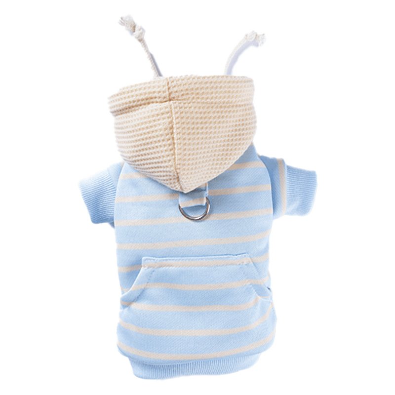 This is a blue striped dog hoodie constructed from terry cloth material featuring a beige waffle hood, adjustable drawstring, front kangaroo pocket and back metal D-ring, produced in sizes from XS to XXL for small dogs and targeted toward wholesale procurement.
