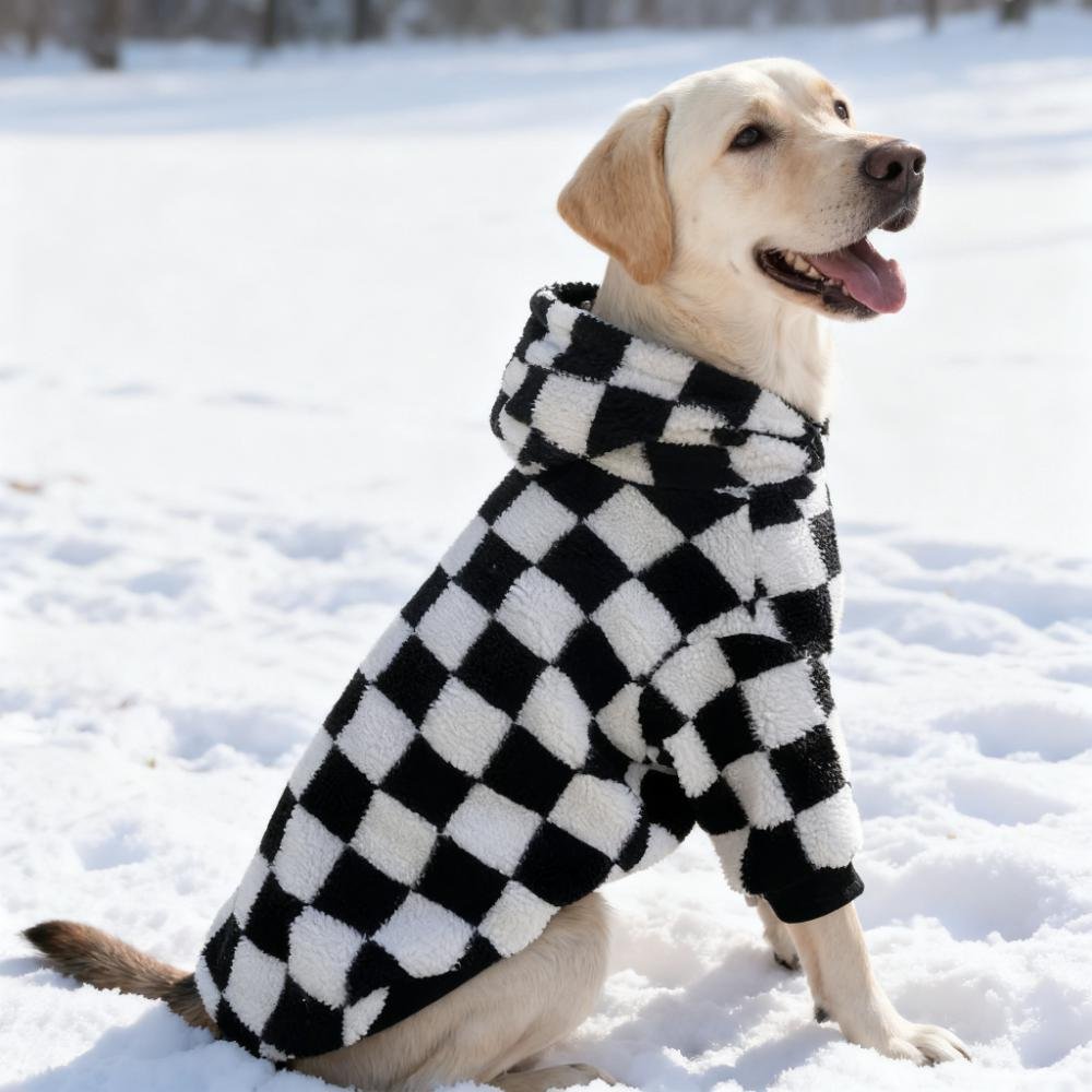 This black and white checkered fleece hooded garment is made of polyester with a soft warm fabric and is designed for medium and large dogs in sizes S to 3XL based on chest back and hip measurements along with recommended weight ranges for winter pet apparel wholesale.