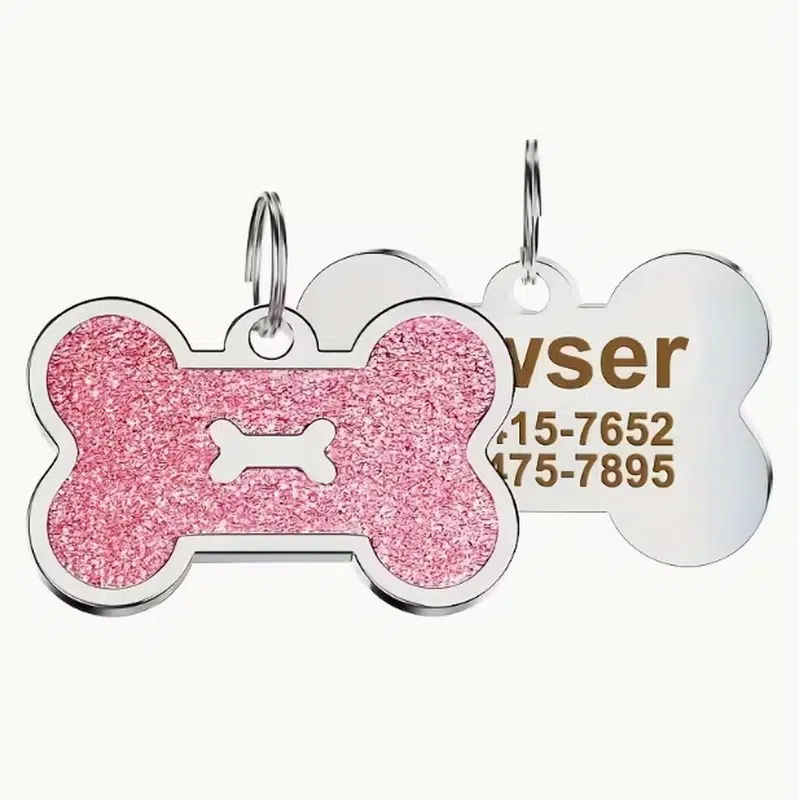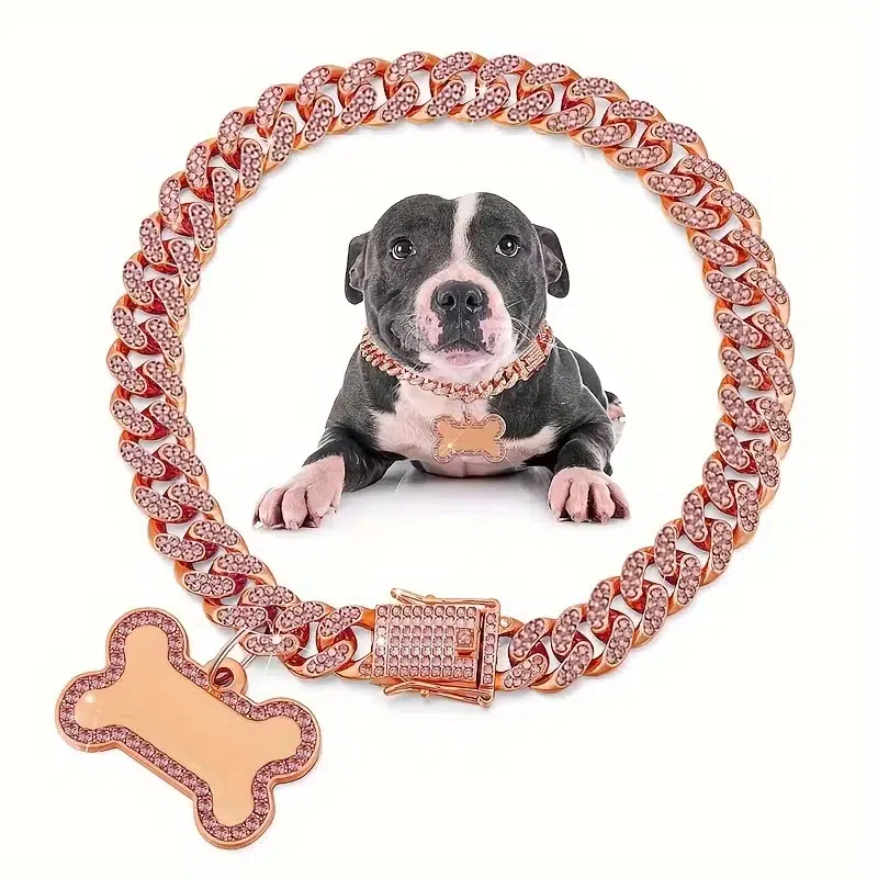 Custom Dog Collars for small dogs—iced metal chain with bone ID tag. Wholesale OEM/ODM customizable colors, sizing, logo engraving & retail-ready packaging.