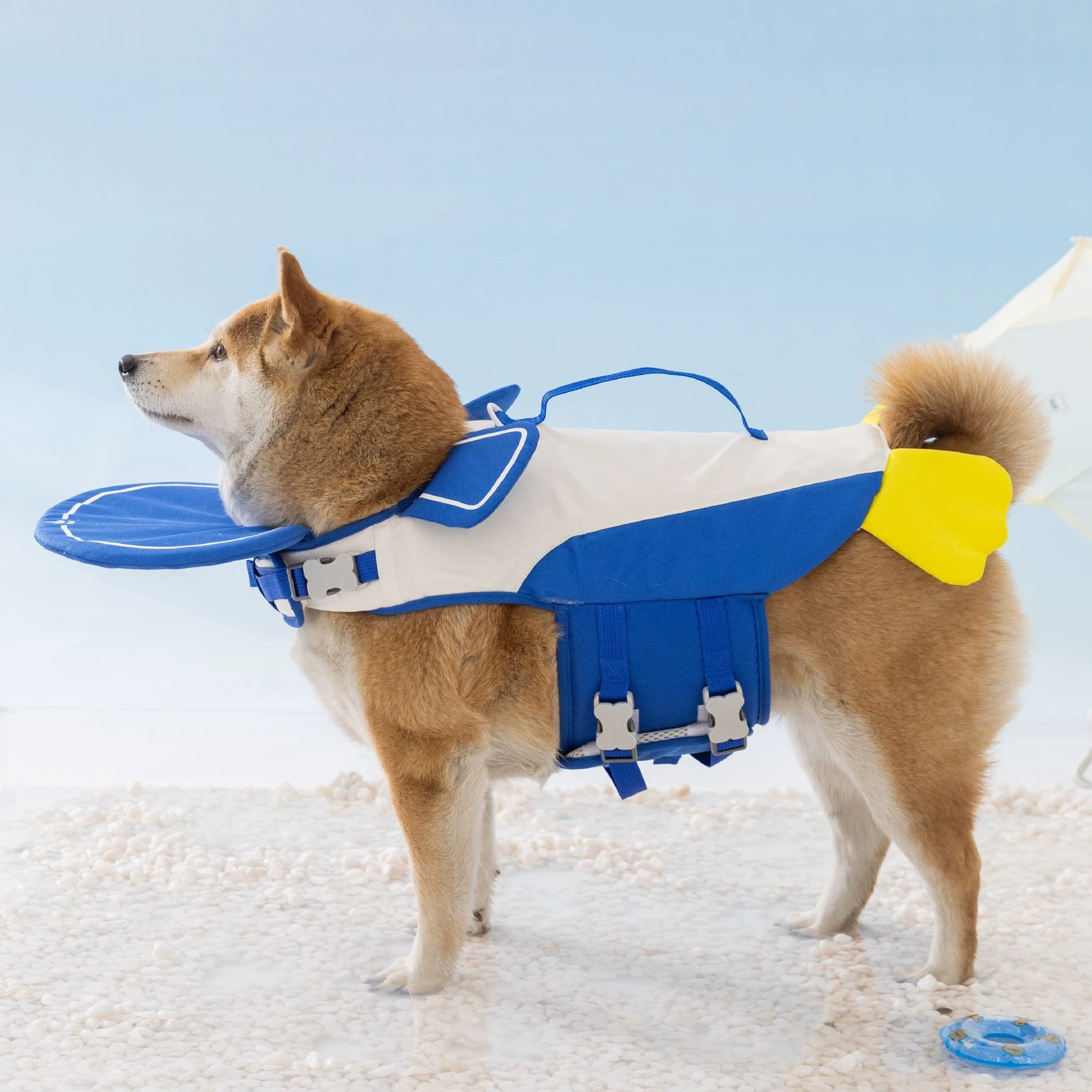 The dog life vest for swimming is an airplane-shaped canine life preserver constructed with Oxford fabric and EPE buoyancy cotton in blue and white color blocking paired with a yellow buoyancy tail fin, adjustable buckle straps, top handle, and propeller accessory, available in sizes XS to XXL for summer pet water activities.