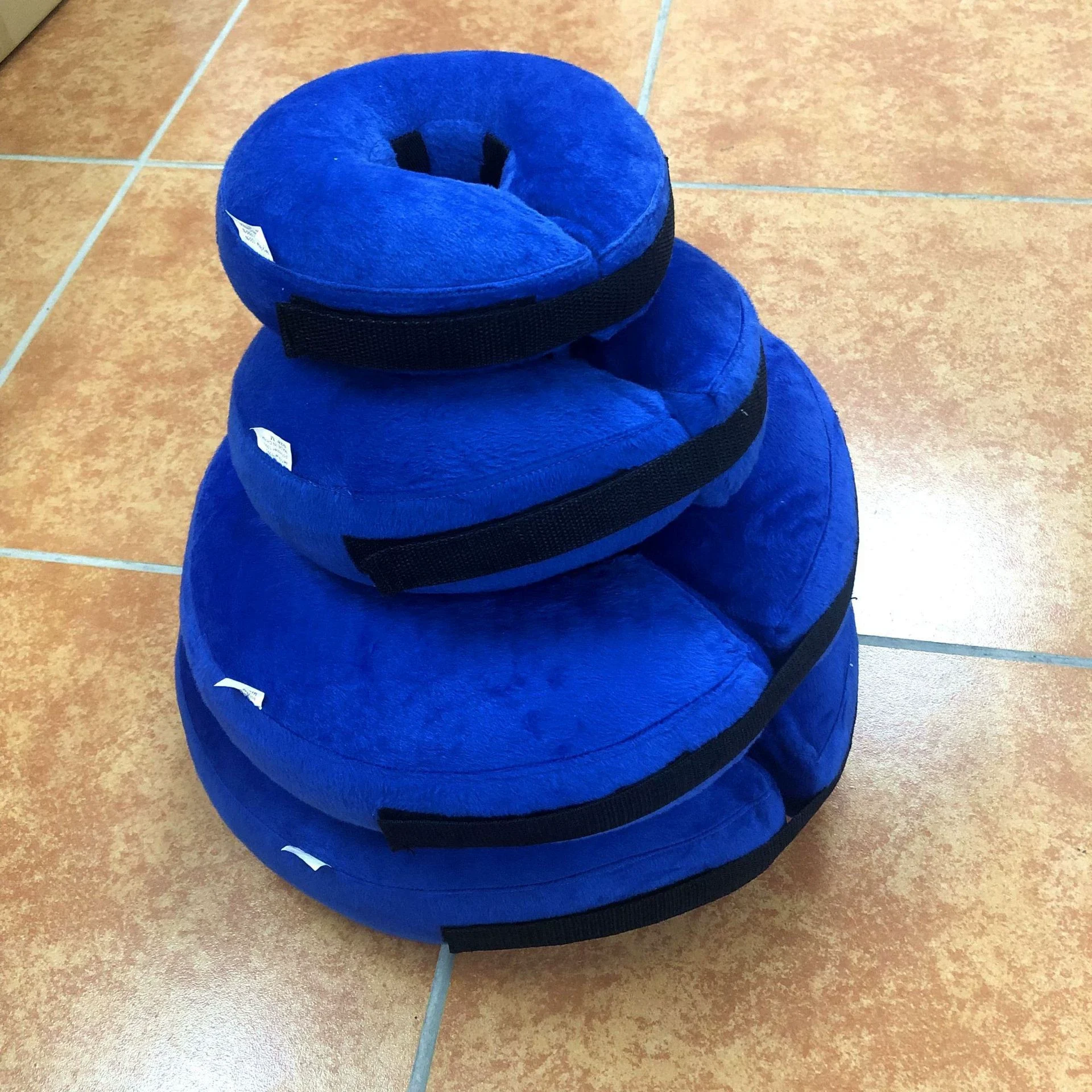 The dog life preserver is a high-quality blue swimming neck collar constructed with soft fleece material, high buoyancy inner core, adjustable nylon buckle strap, and PVC construction available in S (22×23cm), M (27×27cm), L (40×40cm), and XL (45×44cm) sizes for bulk procurement and pet store distribution.