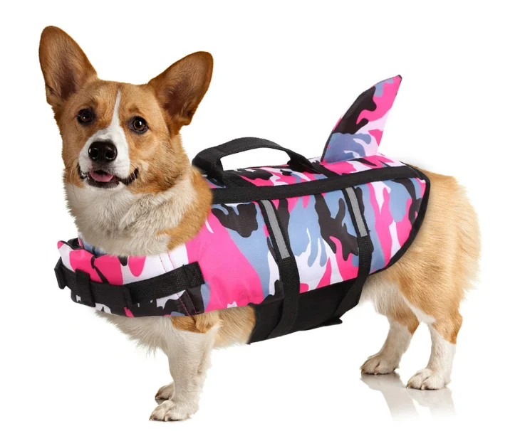 The shark life vest for dogs is a polyester flotation garment with blue camouflage shark fin styling, high buoyancy material, reinforced handle, adjustable buckle straps, and reflective strips, available in four camouflage colors and sizes from XS to 2XL for wholesale water safety applications.